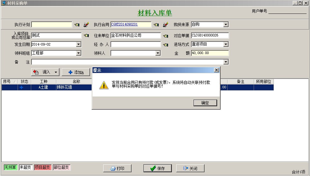 備注:上圖提示為預防超額付款的合同明細提示,點確定即可。