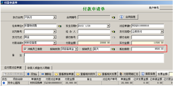 請款人去辦理相關(guān)業(yè)務(wù)之后(如:采購相應(yīng)設(shè)備、支付相關(guān)運(yùn)費(fèi)等),是針對借款做報(bào)銷,首要根據(jù)業(yè)務(wù)類型,創(chuàng)建好相關(guān)業(yè)務(wù)單據(jù)(采購設(shè)備是先做采購入庫單),然后根據(jù)業(yè)務(wù)單據(jù)發(fā)起付款申請生成【付款申請單】,填寫【付款申請單】時(shí)要選擇沖抵員工借款,把之前的借款沖抵掉,這樣在員工借款單統(tǒng)計(jì)表中,報(bào)銷欄就會有相應(yīng)的累計(jì)。