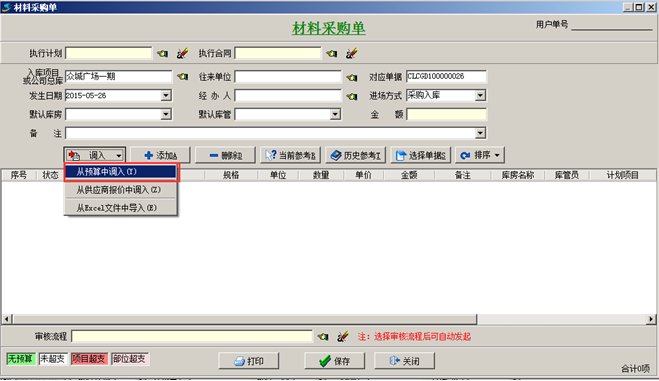 第二步,工程項目材料預算綁定好之后,在進行材料采購的時候可根據預算調入采購材料。如果采購量超出預算量,系統會給出對應的預警提示,如圖: