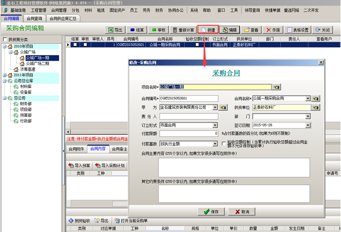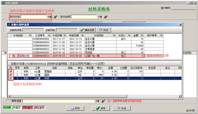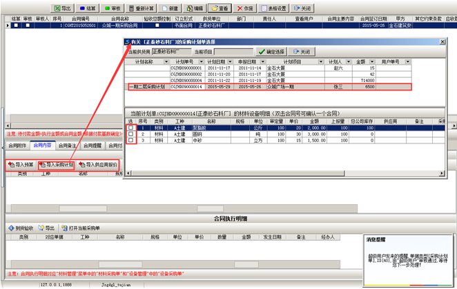 第四步,材料到貨之后,可在【材料管理】模塊,做“材料采購單”,選擇材料的時候,選擇“執(zhí)行合同”,在合同明細里面添加到貨內(nèi)容。如圖: