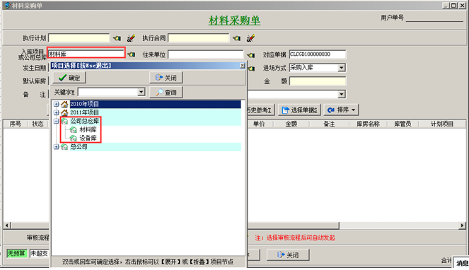 注:如果工程項目材料采購流程規(guī)定材料是入到項目的倉庫中則選擇對應(yīng)的項目上的倉庫,如果采購回來的材料是入到公司總庫,則選擇“入庫項目”為“公司總倉庫”,如圖: