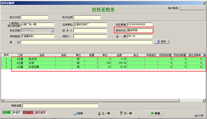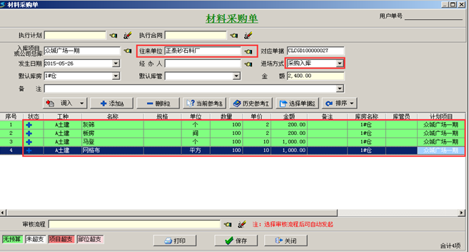 1無預(yù)算,沒有采購計劃以及采購合同的情況,可進行直接采購,做采購入庫單采購入庫或直進項目,這種工程項目材料采購流程適合項目上零星材料的采購。如圖: