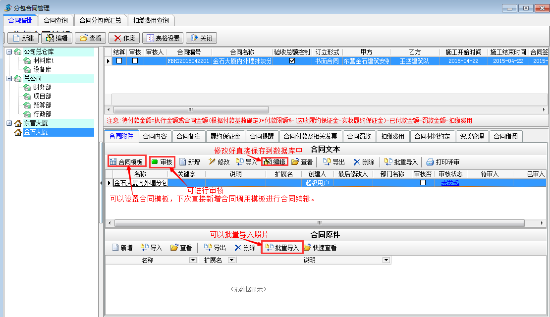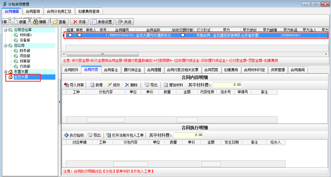 在【合同編輯】中左半部分是合同的分類,分包合同也是按【項(xiàng)目維護(hù)】進(jìn)行分類管理的。一個項(xiàng)目下可以建立多個合同,窗口的右上部分是合同列表,一行信息代表一個合同。右下部位是當(dāng)前合同相關(guān)的內(nèi)容:【合同附件】、【合同內(nèi)容】、【合同備注】、【履約保證金】、【合同提醒】、【合同付款及相關(guān)發(fā)票】、【合同罰款】、【扣繳費(fèi)用】、【合同材料約定】、【資質(zhì)管理】、【合同借閱】。