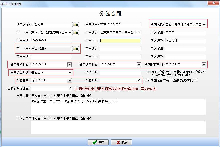 選中[金石大廈]項(xiàng)目點(diǎn)擊【新建】來建立一個合同,界面如下: