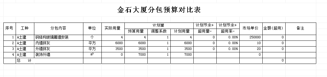 備注:調(diào)整系統(tǒng)說明:在實(shí)際的工程量投標(biāo)中,某些施工企業(yè)為了中標(biāo)而做低預(yù)算量,還有其它的原因如:一些分包根據(jù)以往的施工經(jīng)驗(yàn)總會有一定的偏差。這里用調(diào)整系數(shù)是為了將最終要參與比較的【計(jì)劃用量】、【計(jì)劃用量】調(diào)整到接近于預(yù)期最真實(shí)的值。