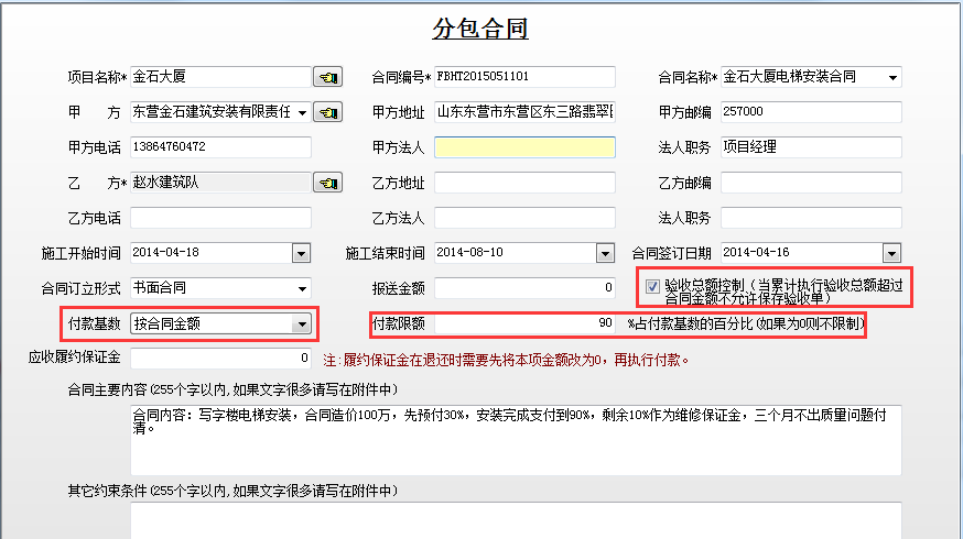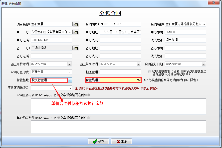 上圖帶紅框的注意填寫正確,其中帶*為必填項(xiàng)。尤其注意【付款基數(shù)】、【付款限額】這些項(xiàng)都會直接影響到該合同的待付款。