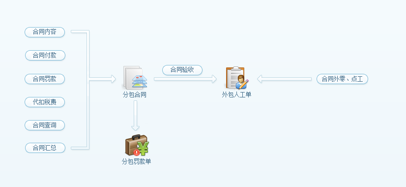 工程項(xiàng)目分包管理,可用于統(tǒng)計(jì)專業(yè)分包產(chǎn)生的成本及臨時雇用的零工成本。如軟件流程圖所示:分包成本是由外包人工單產(chǎn)成,其來源可分為兩部分,第一:來自分包合同中的合同驗(yàn)收,第二:來自合同外零、點(diǎn)工驗(yàn)收。