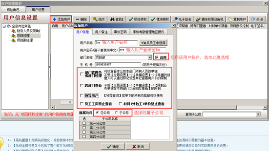 輸入用戶名稱(可從員工中選擇),輸入用戶“登錄密碼”,選擇“部門名稱”,啟用該用戶則可勾選“啟用”的復選框,可按照用戶的崗位及權限選擇對應的查看權限,選擇用戶歸屬子公司。