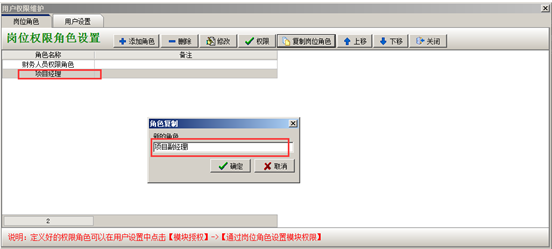 如果建立的新的崗位角色跟目前系統(tǒng)中現有的崗位角色擁有同樣的系統(tǒng)操作權限,可選中當前崗位角色,點擊“復制崗位角色”的按鈕,復制完成之后,新的崗位角色跟當前崗位角色擁有同樣的系統(tǒng)操作權限,如圖: