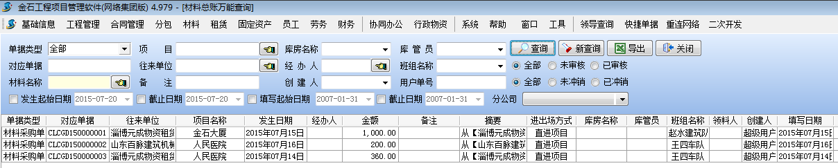 2.3.1設置項目隱藏前查詢時統(tǒng)計所有項目數據,我們以材料總賬萬能查詢?yōu)槔缦聢D