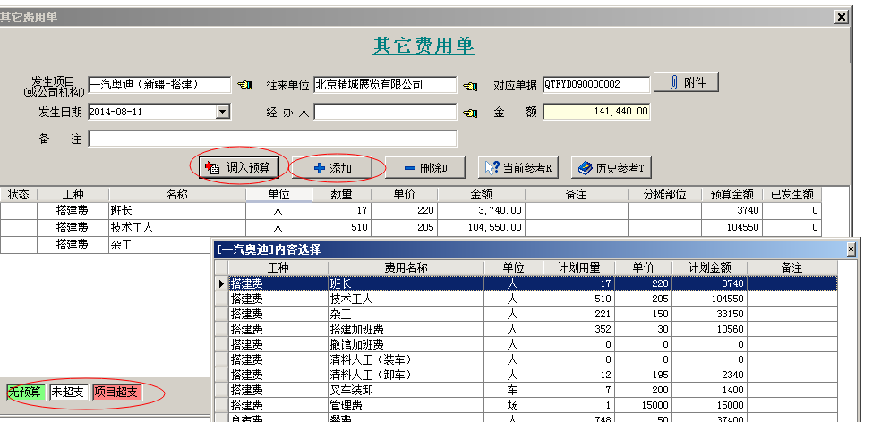 在單據(jù)中我們可以使用添加【按鈕】進(jìn)行添加,也可以使用【調(diào)入預(yù)算】功能,從預(yù)算里面調(diào)入。另外在單據(jù)中有預(yù)警機(jī)制,如果添加預(yù)算外的內(nèi)容就明細(xì)會(huì)顯示綠色,超過(guò)預(yù)算的就會(huì)明細(xì)顯示紅色。