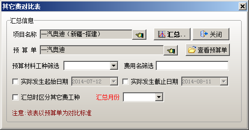 使用時(shí)選擇好項(xiàng)目,選擇好預(yù)算單,然后點(diǎn)【匯總】按鈕,進(jìn)行統(tǒng)計(jì)。