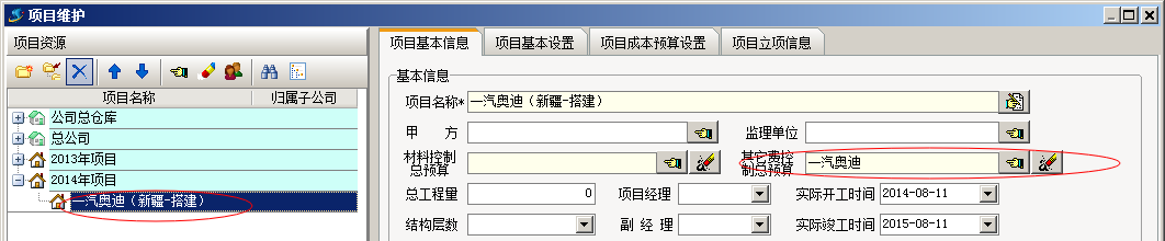 在預(yù)算單中,點(diǎn)【添加】按鈕就會(huì)彈出之前設(shè)定好的科目,以供我們選擇使用。添加完成后,點(diǎn)保存按鈕進(jìn)行保存。保存完成后,我們可以在工程管理模塊【項(xiàng)目維護(hù)】中進(jìn)行預(yù)算與項(xiàng)目綁定。