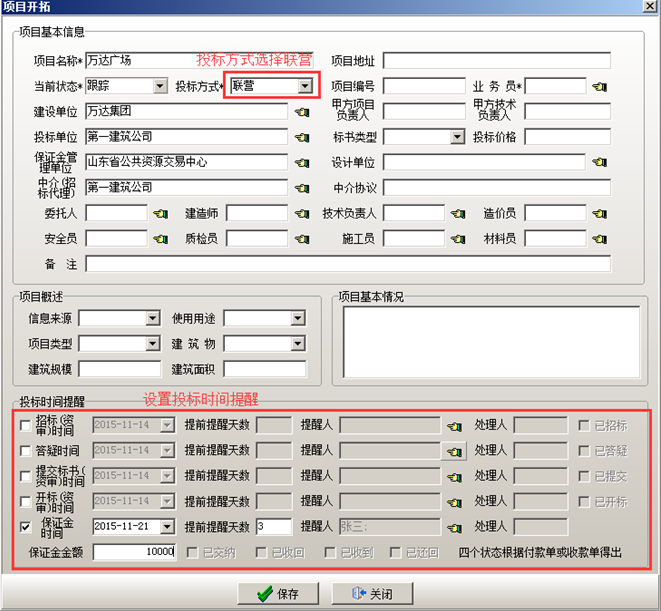 項(xiàng)目狀態(tài)編輯維護(hù)完成之后可在工程管理軟件中建立項(xiàng)目。在工程管理軟件的“項(xiàng)目開拓”中輸入包括個(gè)往來單位以及負(fù)責(zé)人等項(xiàng)目基本信息。也可在投標(biāo)時(shí)間提醒里面設(shè)置“招標(biāo)(資審)時(shí)間”,“答疑時(shí)間”,“提交標(biāo)書時(shí)間”,“開標(biāo)時(shí)間”,“保證金”提醒時(shí)間,時(shí)間設(shè)置完成之后,被提醒的用戶會(huì)在相應(yīng)的時(shí)間收到相關(guān)的提醒內(nèi)容。投標(biāo)保證金,在投標(biāo)保證金對(duì)應(yīng)的復(fù)選框打鉤,設(shè)置投標(biāo)保證金的時(shí)間,提前提醒的天數(shù),被提醒人以及金額。如圖所示:
