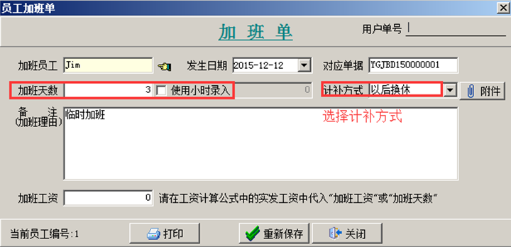 工程管理軟件中添加員工加班單的基礎信息,輸入加班天數(如果加班是以小時計算則在“使用小時錄入”的復選框打鉤),選擇“計補方式”為“以后換休”。如圖: