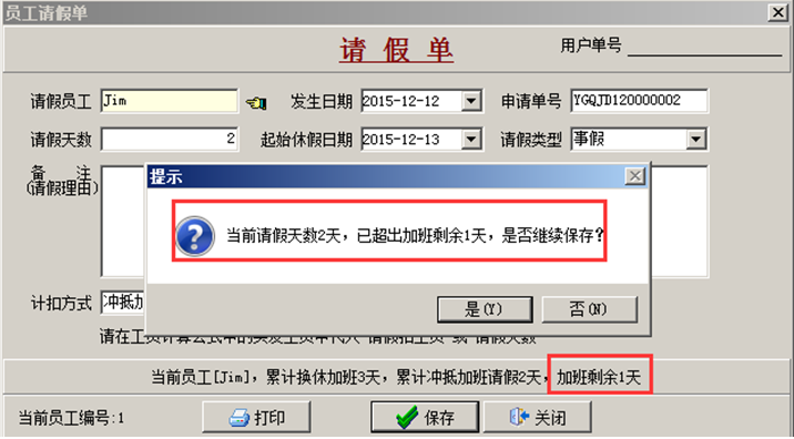 員工再次請假并且累計請假天數超過加班天數時系統給出提示。如圖所示: