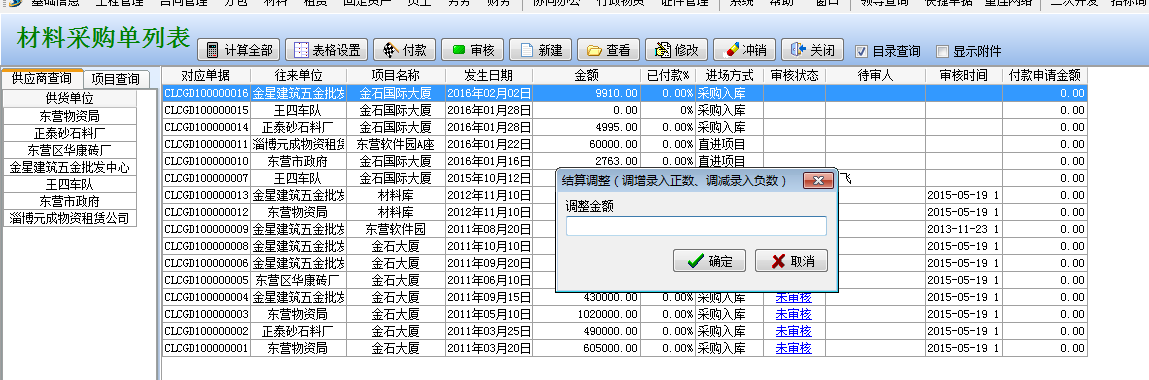這時單據的金額為9910元,待付款金額是9910元。假如在結算時供應商優惠10元,則實際需付款金額為9900元。在項目管理軟件材料采購單列表選中單據,右鍵選擇設置結算調整金額。如下圖: