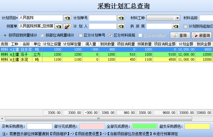 如何在金石工程項目管理軟件中查看材料的“計劃上報量”、“計劃審定量”、“調入量”、“到貨數量、項目消耗量”、“預算數量”