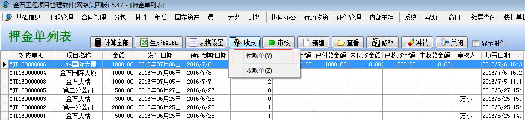 金石工程項(xiàng)目管理軟件押金管理的整體流程: