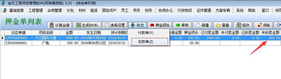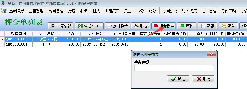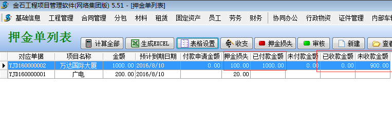 金石工程項(xiàng)目管理軟件押金管理未收款的計(jì)算原則: 押金已付款且“已到預(yù)計(jì)到期日期”,未收款金額=已付款金額—已收款金額—押金損失