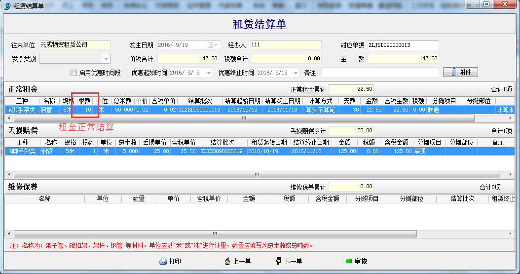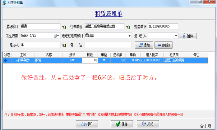 3、在還的時候發現其中有一根6米的損耗成5.5米了,把自己的1根6米還給對方,租金扔按10根6米算。(實際是把損耗后的5.5米與自己的6米做了對換,即:歸還給了淄博元成物資租賃公司6米,自己實際還剩下一根5.5米鋼管)