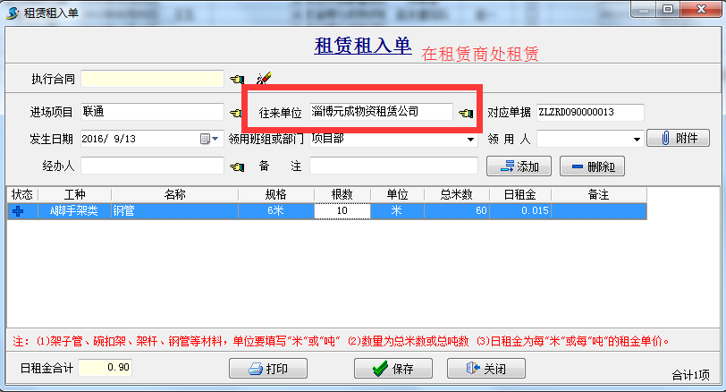 2、 租入對方單位“淄博元成物資租賃公司”10根6米的鋼管