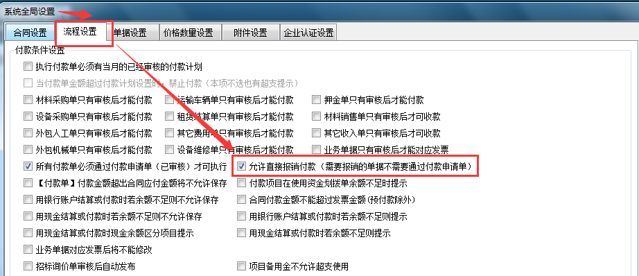 流程設(shè)置→允許直接報銷付款打鉤(需要報銷的單據(jù)不需要通過付款申請單)