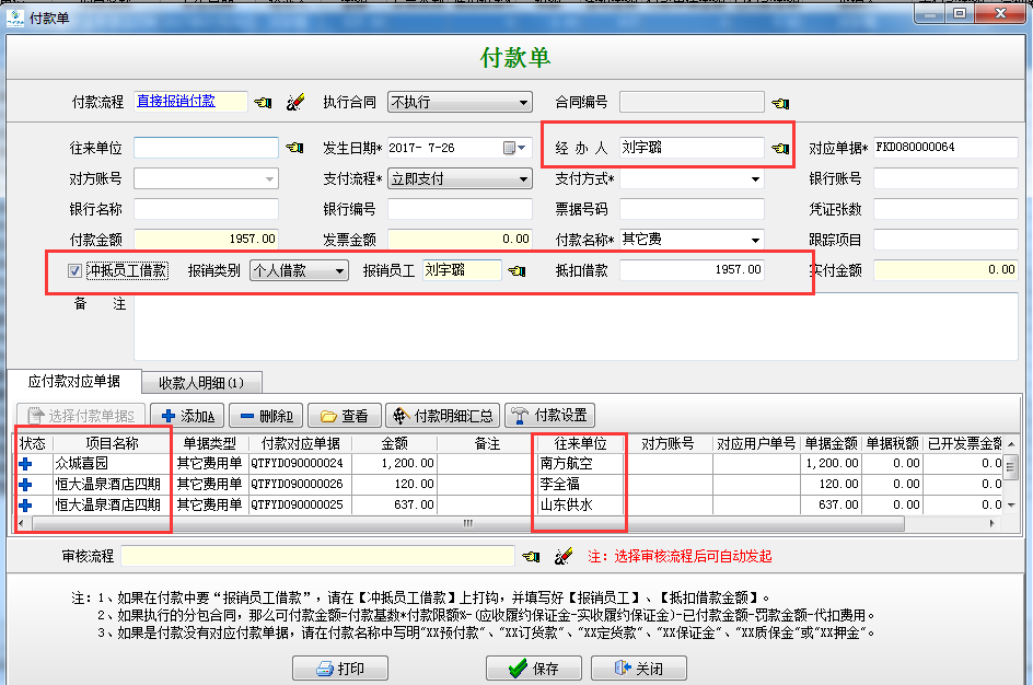 在工程項目管理軟件中如果某個員工在多個項目任職,又有多個往來單位都產(chǎn)生業(yè)務(wù)往來,都要進(jìn)行報銷付款(沒有對應(yīng)合同的前提下),按住ctrl鍵選擇待付款的單據(jù)(需單據(jù)的經(jīng)辦人是相同的)