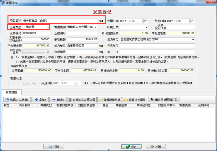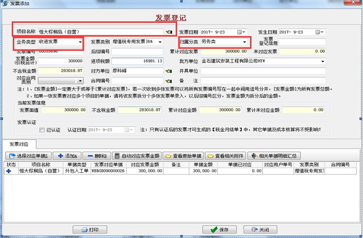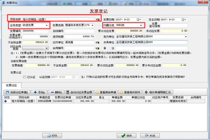 ②進(jìn)項(xiàng)稅對應(yīng)材料票:菜單欄【財(cái)務(wù)管理】→【發(fā)票管理】“收進(jìn)發(fā)票”歸屬分類選材料票(在一個項(xiàng)目中應(yīng)控制材料票、勞務(wù)票等所占的比例,此功能用于計(jì)算掛靠單位發(fā)票歸屬所占百分比)