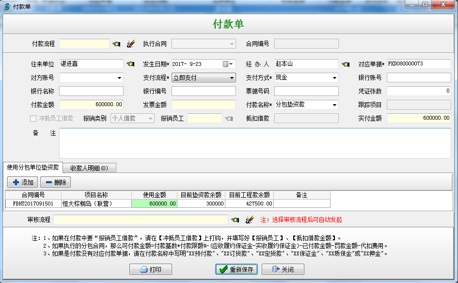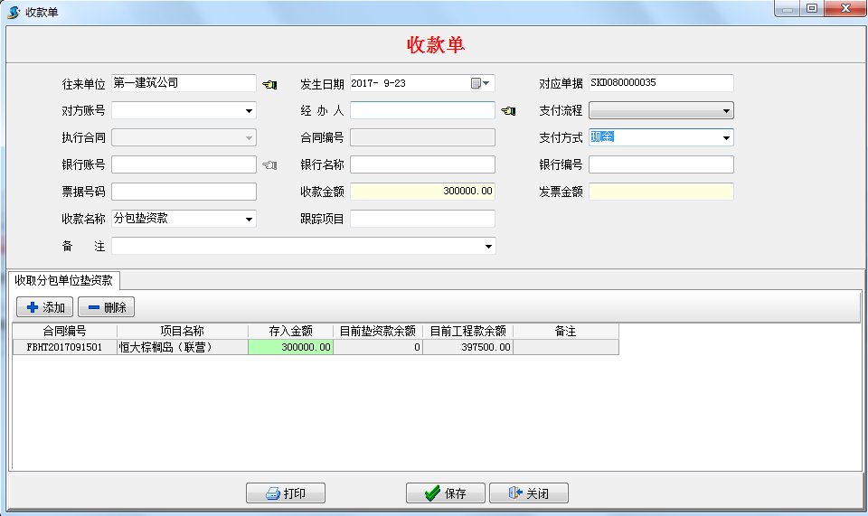 ④“分包合同”→“墊資款記錄”→“執(zhí)行收款”, 【收款單】墊資款收到(此處的往來單位是掛靠我公司資質(zhì)的聯(lián)營單位)