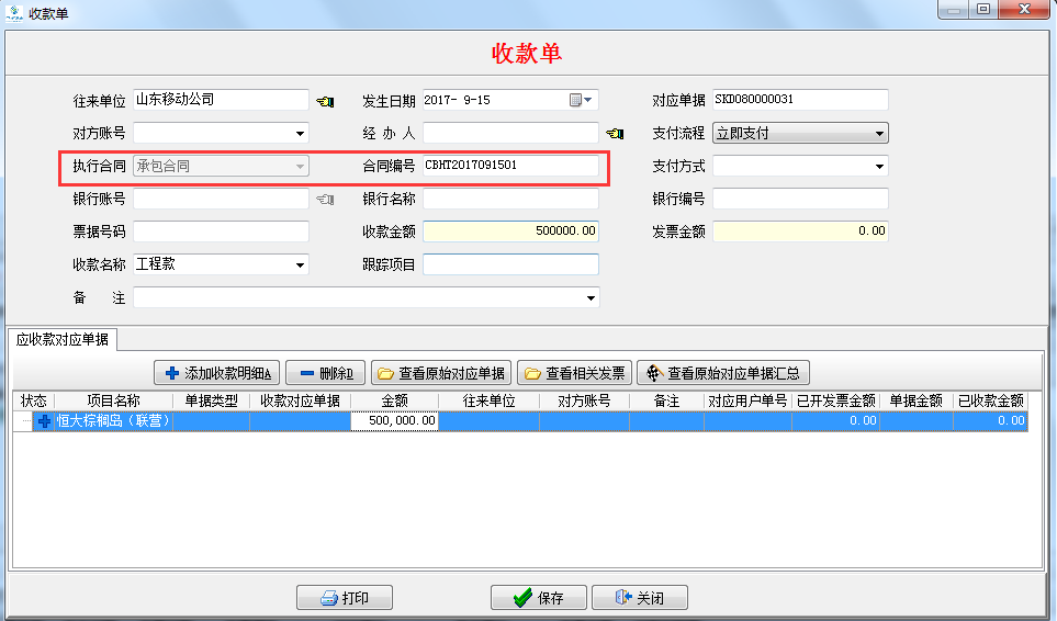 ③“分包合同”“按承包合同收款”,并“對應(yīng)承包合同編號” “關(guān)聯(lián)成本項(xiàng)目”(為了查詢發(fā)票情況自動匯總和歸屬分類)