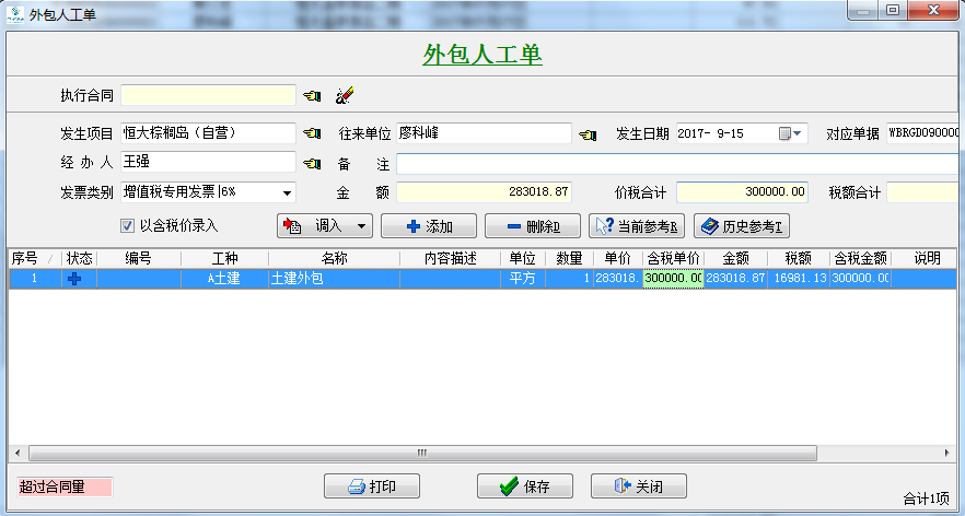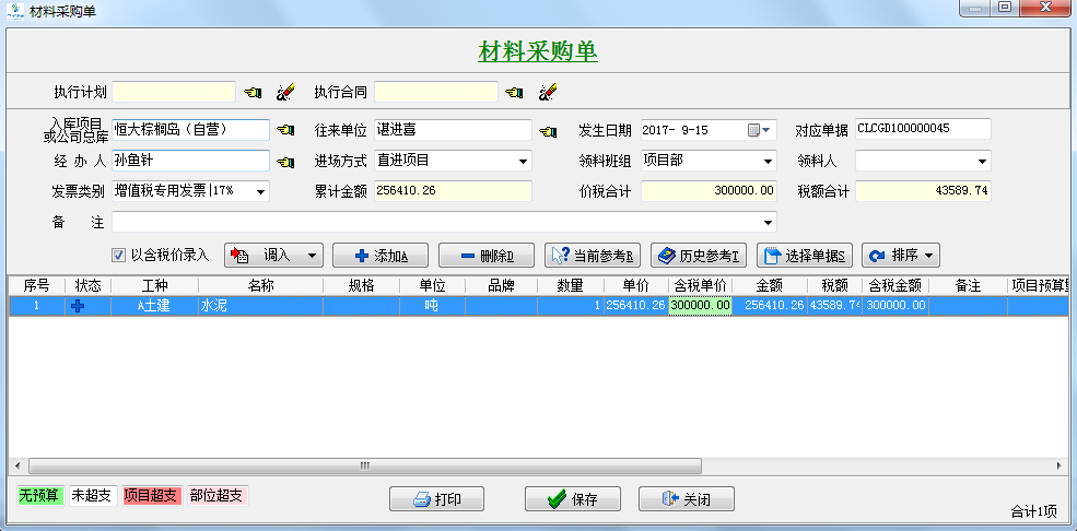 ①在“恒大棕櫚島(自營)”項(xiàng)目下驗(yàn)收(如有預(yù)算先做預(yù)算單)【材料采購單】和【外包人工單】各30萬元并對應(yīng)“進(jìn)項(xiàng)發(fā)票”。