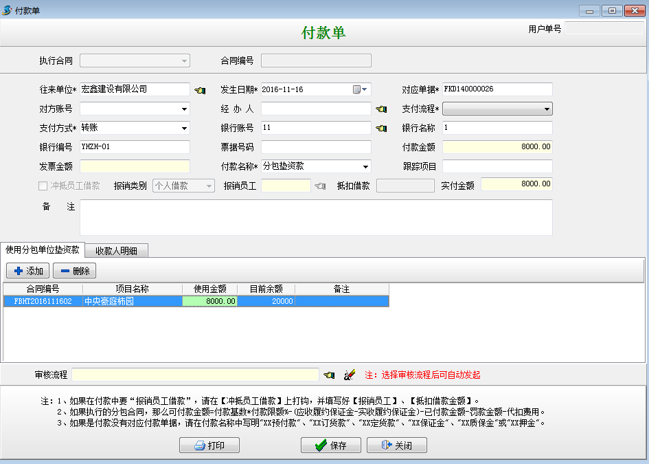 在【分包合同】-【墊資款記錄】處選擇執行付款,或者在【財務管理】-【付款單收款單】新建付款單選擇墊資款付款。