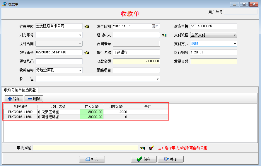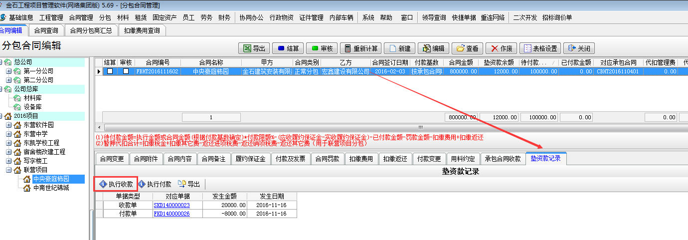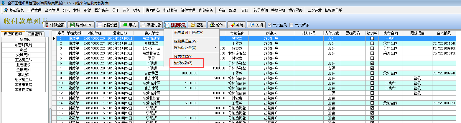 在工程項目管理軟件【分包合同】-【墊支款記錄】處選擇執行收款,或者在【財務管理】-【付款單收款單】新建收款單選擇墊資款收款。