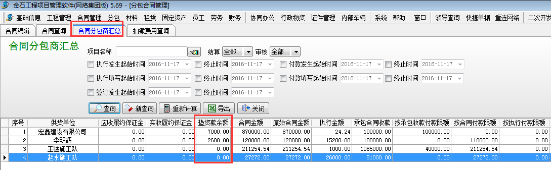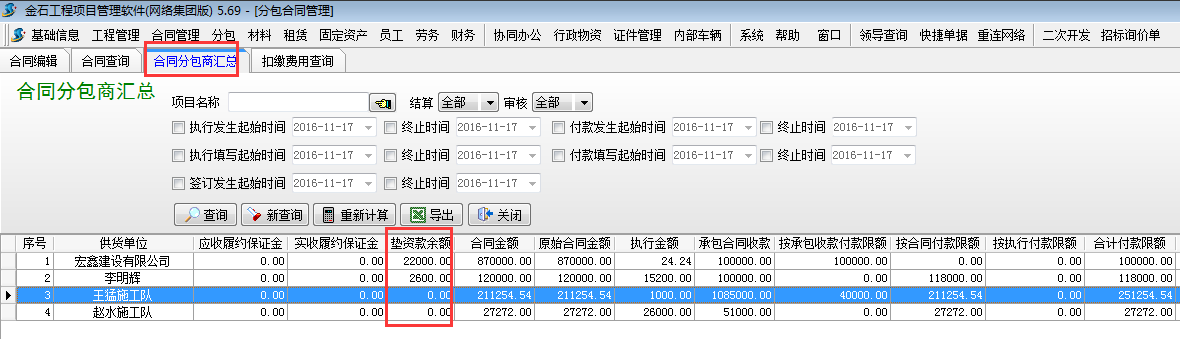 3.1 查詢聯營單位所有墊資款余額。可以在【分包合同】-【合同分包商匯總】處查詢。