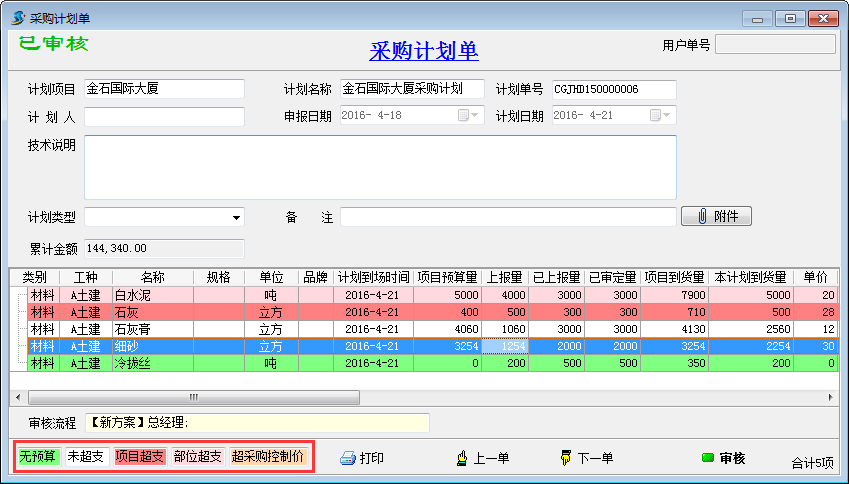 只要項目設置好材料控制預算,具有該權限的人員登陸系統后會顯示所授權項目材料超用情況。