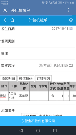 在項目施工過程中,租賃機械的時間統計和錄單效率較傳統且效率低下,為此金石軟件團隊開發了手機掃描二維碼實現快速錄入外包機械單的功能。具體的功能實現如下     在項目施工過程中,租賃機械的時間統計和錄單效率較傳統且效率低下,為此金石軟件團隊開發了手機掃描二維碼實現快速錄入外包機械單的功能。