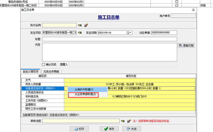 項目部人員選擇項目之后,右鍵點擊下圖中黃色區域,選擇彈出框中的“從業務單據取值”,系統會根據當前發生日期所填報的【勞務考勤單】、【材料驗收單】、【機械日報單】自動生成當天的施工日志。