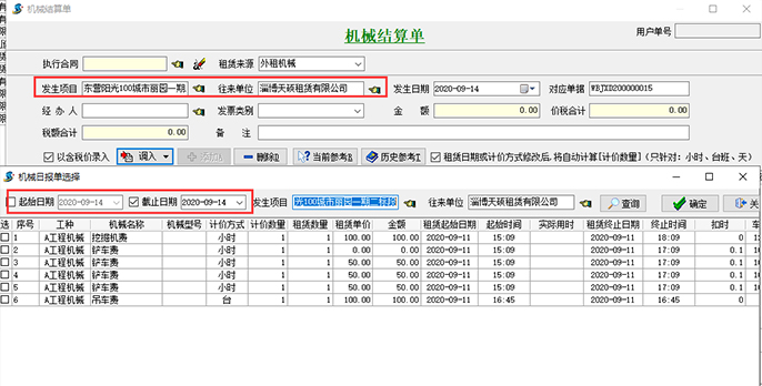 【機械結算單】需先設置發生的項目和往來單位,根據下圖所示:點擊圖中“調入”按鍵,選擇起始日期和截止日期(截止日期默認是錄單日期),選中下方涉及的租賃明細生成一張完整的【機械結算單】。