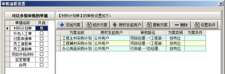在多級審核中,可以設置多套審核方案,每套方案可設置多個崗位,可設置方案的授權發起用戶(在業務單據中選擇該審核方案的用戶)。在添加方案時,有三種方式逐級審核、平級審核、跨級審核。逐級審核是指各個崗位按先后順序依次審核該業務單據,例如審核順序為,工程部、預算部、經營部、總經理如下圖: