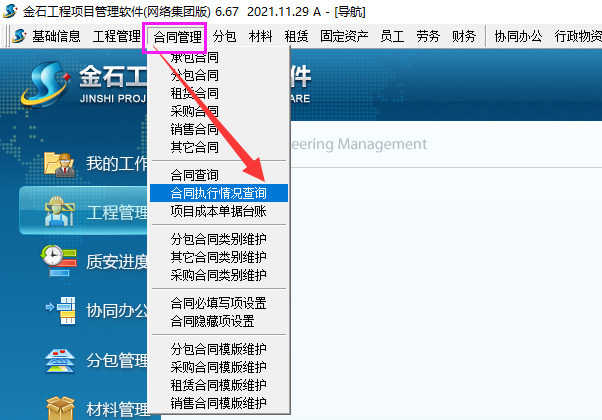 操作步驟:菜單欄→合同管理→合同執行情況查詢