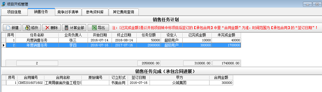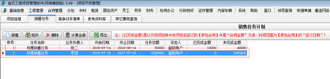 施工項目管理軟件【項目開拓】-【銷售任務】是用來管理企業給業務員設定銷售任務計劃的模塊。