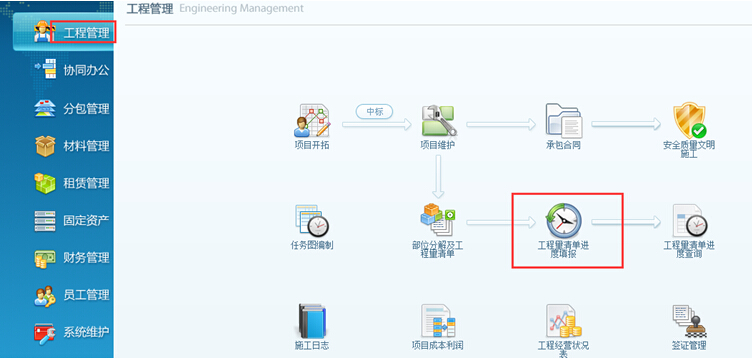 工程項目管理系統中進行項目進度查詢時,系統會根據項目部分以及工程量清單匯總項目進度。如圖: