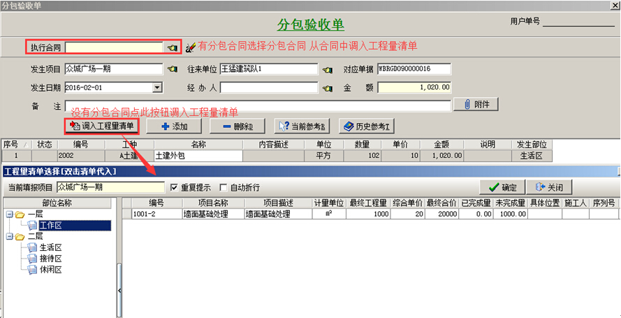 (2)分包驗收單中,如果簽訂了分包合同點[執行合同],從合同內容中選擇清單,否則點擊[調入工程量清單],把工程量清單調入分包驗收單中。如圖: