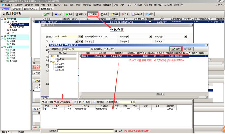 (1)選中對應的分包合同點擊“新建”按鈕,把工程量清單導入合同中。如圖: