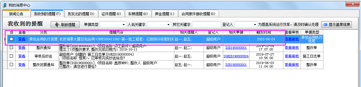 提醒人查看處理完消息后系統還可以顯示處理人。