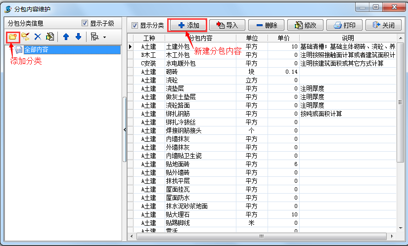 在做工程項目分包管理之前要做好往來單位維護,人工工種維護,分包內容維護,罰款分類維護,分包預算單維護。1.往來單位維護