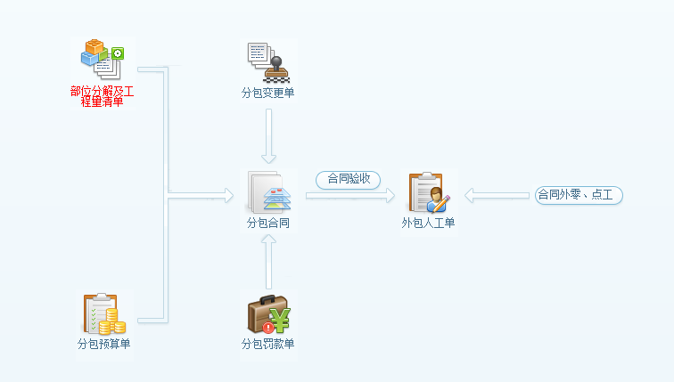 工程項目分包管理,可用于統計專業分包產生的成本及臨時雇用的零工成本。如軟件流程圖所示:分包成本是由外包人工單產成,其來源可分為兩部分,第一:來自分包合同中的合同驗收,第二:來自合同外零、點工驗收。