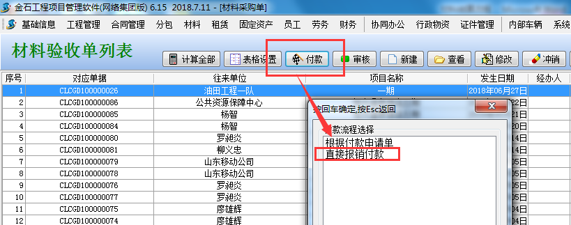 在材料采購單列表中找到需要報銷的單據(jù),選擇“直接報銷付款”