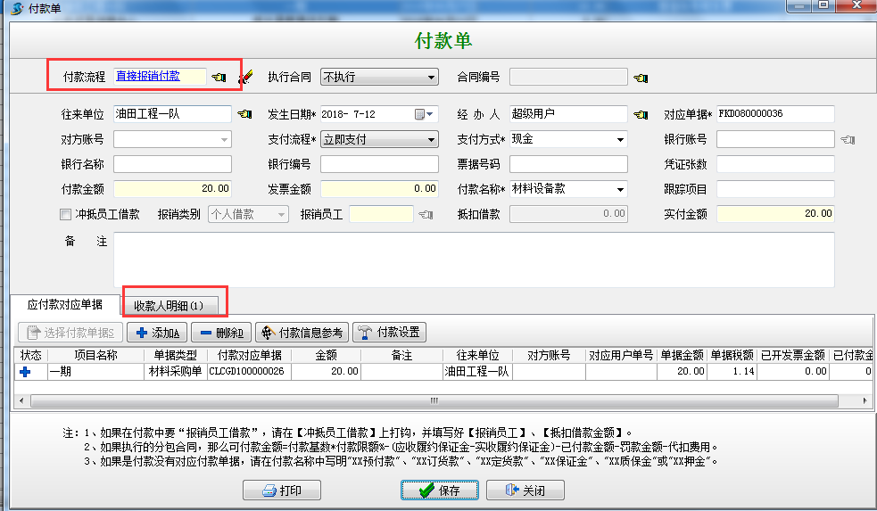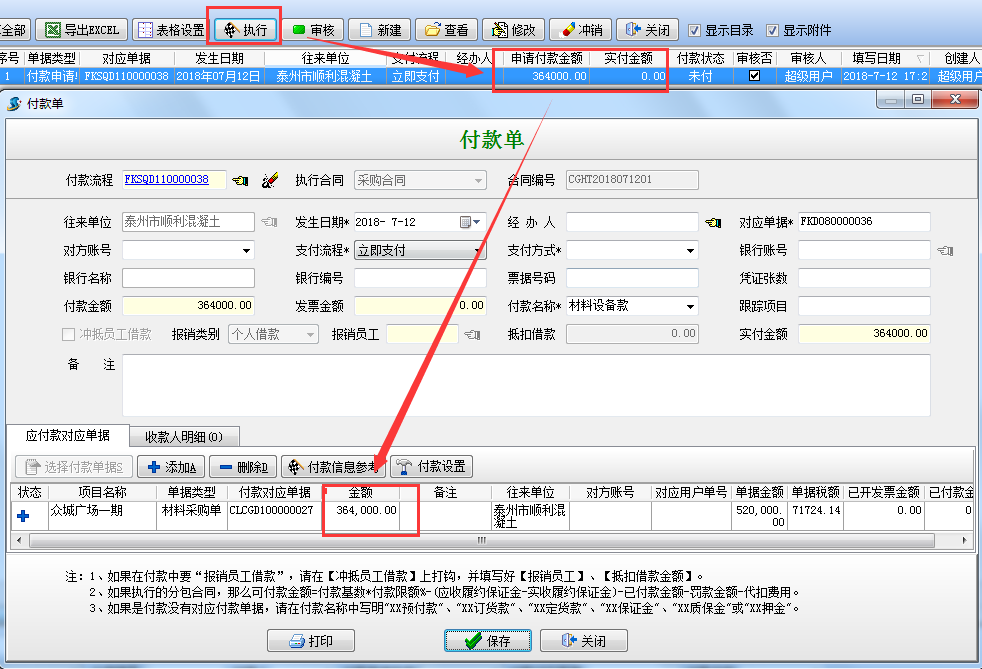 選擇“執(zhí)行付款”根據(jù)向?qū)Ш笙到y(tǒng)會自動根據(jù)材料單據(jù)金額*付款比例,自動得出待付的金額